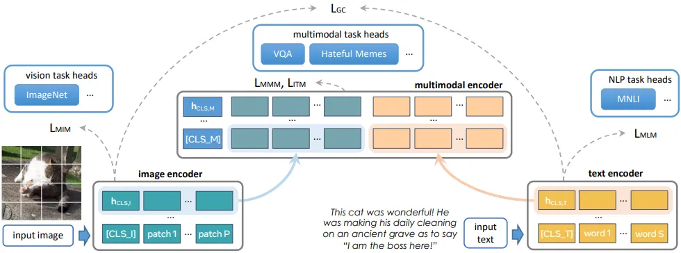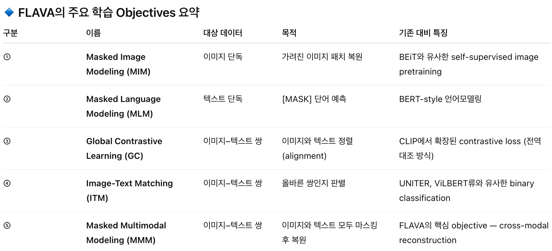 - 이미지–텍스트 쌍(batch of pairs) → Contrastive + Matching + Masked Multimodal (GC + ITM + MMM)