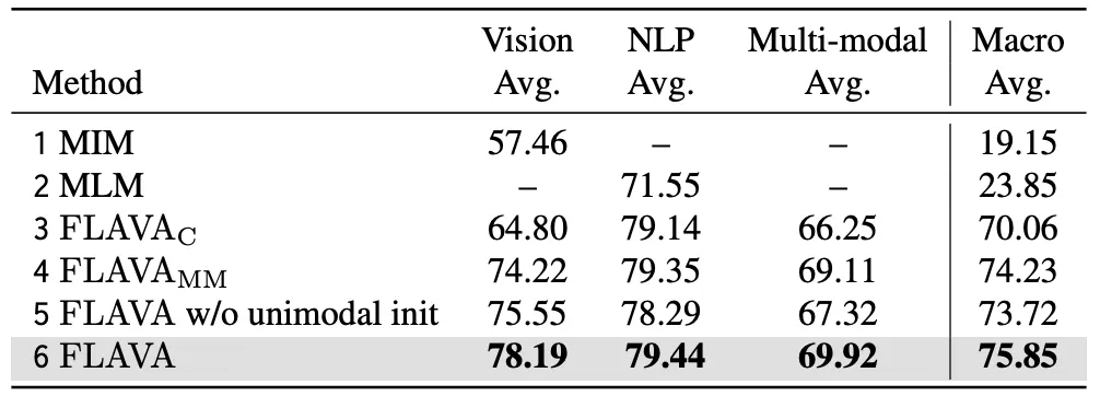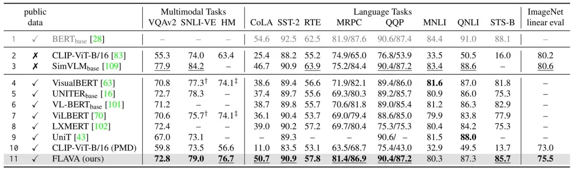 ⇒ FLAVA는 이러한 한계를 넘어 하나의 총합적인 “foundation” 모델로서 vision task, language task, cross-modal task, multi-modal task 모두에서 우수한 성능을 달성하는 범용 vision-language 모델 을 구현